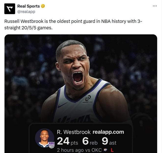 此役,威少還創(chuàng)下了紀(jì)錄。數(shù)據(jù)顯示,威少已經(jīng)連續(xù)三場砍下至少20分5板5助攻,為做到這點(diǎn)歷史最老后衛(wèi)(36歲361天)。