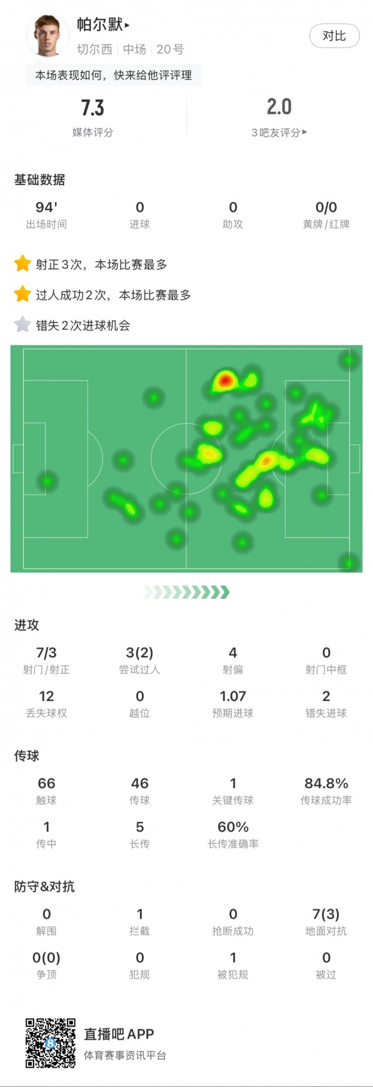 帕爾默全場數(shù)據(jù):7次射門3次射正,2次錯失絕佳機會