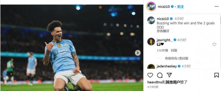 3月2日訊 足總杯1/8決賽,曼城3-1普利茅斯。賽后,本場(chǎng)比賽打進(jìn)2球的奧賴?yán)铝俗约旱膇ns。