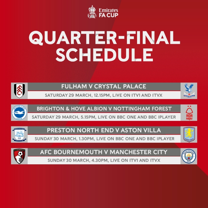 英足總公布足總杯1/4決賽比賽時(shí)間:3月30日曼城客場(chǎng)對(duì)陣伯恩茅斯